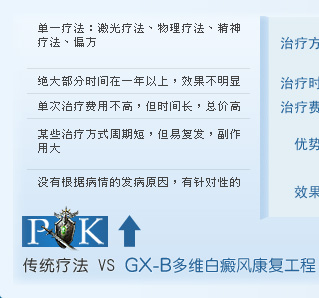 GX-B多维白癜风康复工程由16项核心技术和超百项辅助技术支撑,从遗传、自身免疫、神经化学因子、黑素细胞自身坏死等病因入手,从白癜风的各个发病病因和机理去考虑,根据检测的结果进行科学的组合、多维的立体的综合的治疗。涵盖了无创无痛黑色素细胞培植术、七大权威病因检测、九大综合康复...[详情]