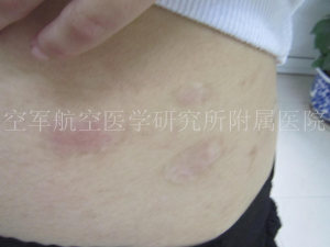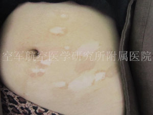 ▲病史:患者主诉3年前发现腹部片状白斑,在别的医院治疗,注射:不详,治疗效果不佳,今日来我院就诊。