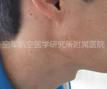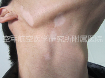 ▲病史:患者两年前发现前颈部片状白斑,曾经在当地医院治疗,(药名不详),治疗效果不佳,今日来我院就诊。
